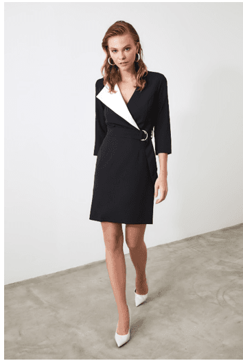 İş kıyafetleriniz için siyah ve beyaz renklerden oluşan bir elbise de tercih edebilirsiniz. Bu tarz bir elbisenin altına kırmızı bir ayakkabı giyebilirsiniz. Ayakkabının renk seçimi size kalmış. Renkli ayakkabılar elbisenize canlılık getirir. Elbisenin yakası açık olduğu için ince bir kolye elbisenin tamamlayıcısı olur. Trendyol’da satışta olan bu elbiseyi iş hayatında rahatlıkla kullanabileceğinizi düşünüyorum.