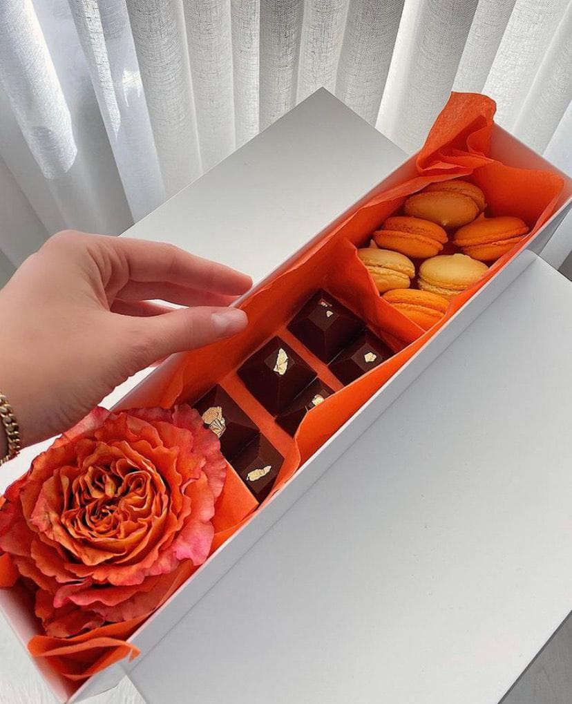 DP: Kişiye özel hazırladığımız kutuların konseptlerini müşterilerimiz belirliyor. Müşterilerimiz hediye çiçek, makaron, brownie, çikolata, beze, çikolata kaplı, çilek, kurabiye, cupcake, donut, tartolet, ekler, kruvasan ve minik içki şişeleri istenilen renk tonları kullanarak kutularımızda müşterilerimize sunuyoruz.