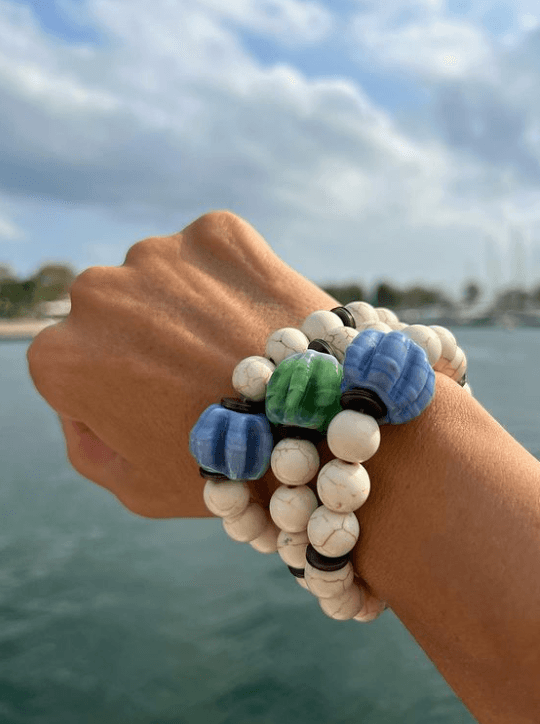 ÖK: Murano cam boncuklar, örgü ahşap boncuklar ve keçelerle yaptığım ‘bonita’ modelim – açık ara – yaz mevsimi için favorim. Bu modelin güzelliği her birinden sadece tek bir model olması, kişiye özel ve eşsiz olduğu için daha anlamlı geliyor. Üstelik renk konusunda en özgür olduğum model, yaz renklerini dilediğim ölçüde kullanabiliyorum. ‘Puffy’ isimli volkanik doğal taşlar ve keçe ile hazırladığım, yine birbirinden canlı renkleri kullandığım bir başka model de yaz için tercih edilen ve ‘bonita’ ile kombinasyon şeklinde takılabilen bir bileklik.