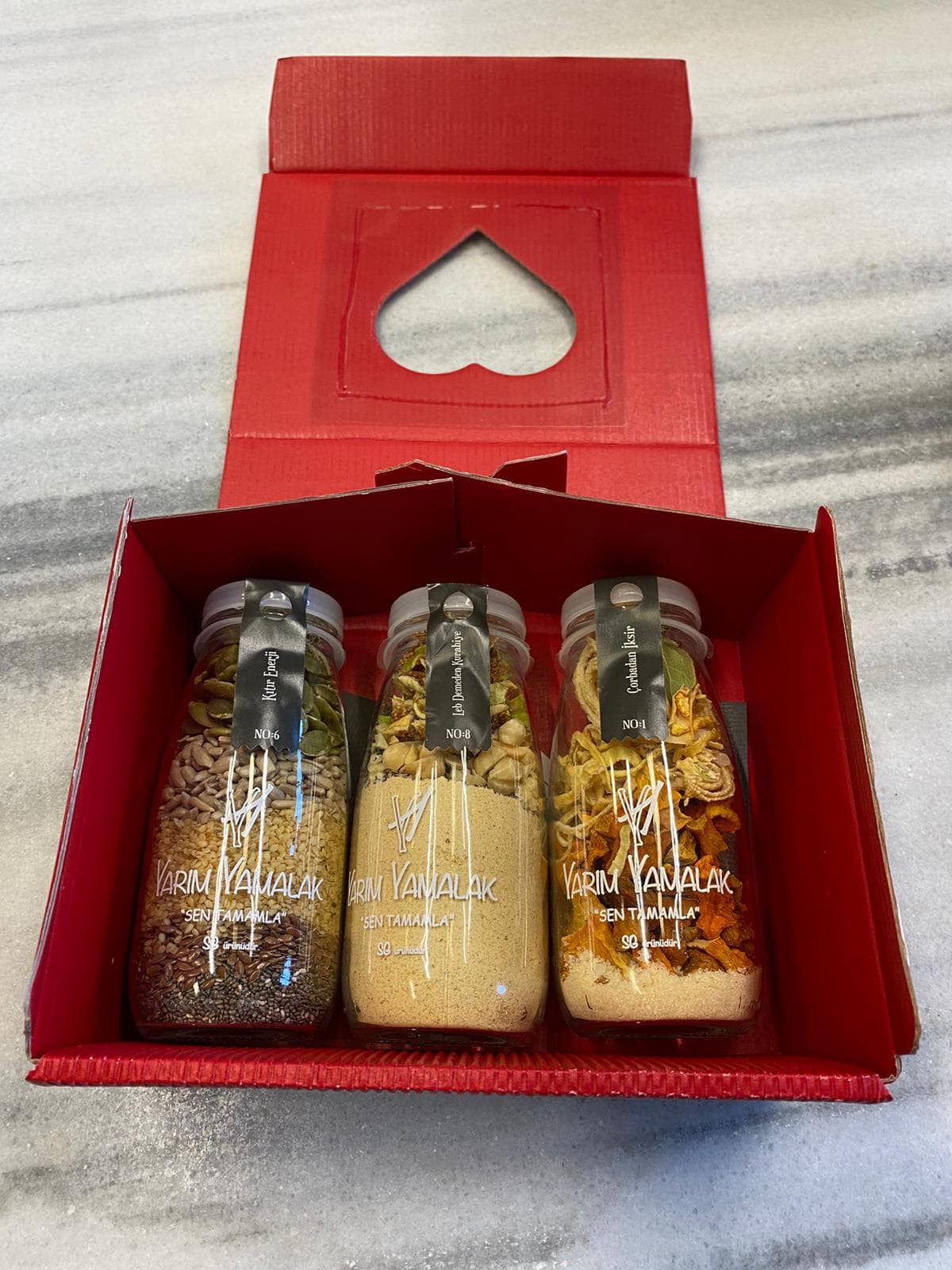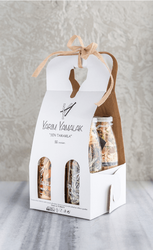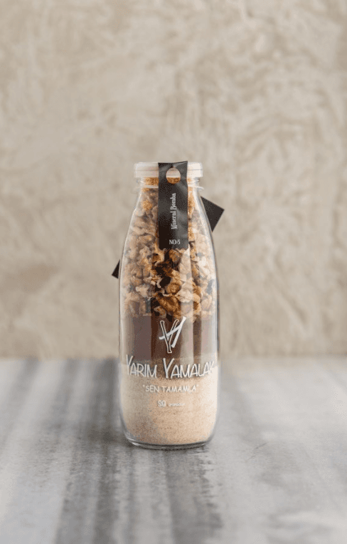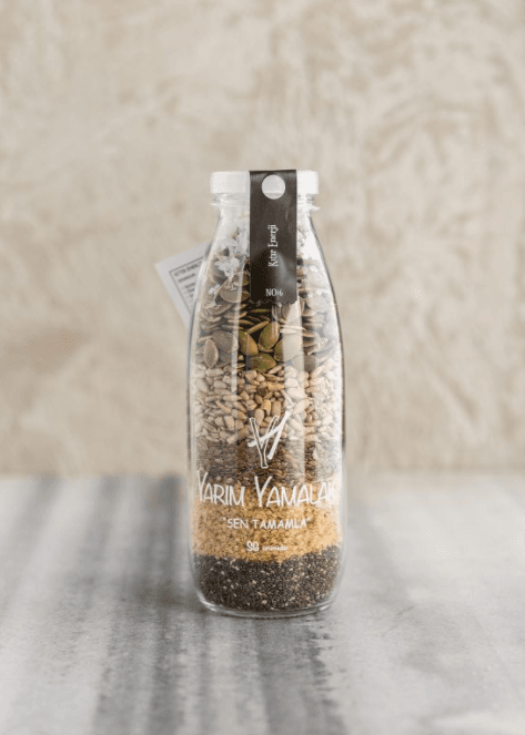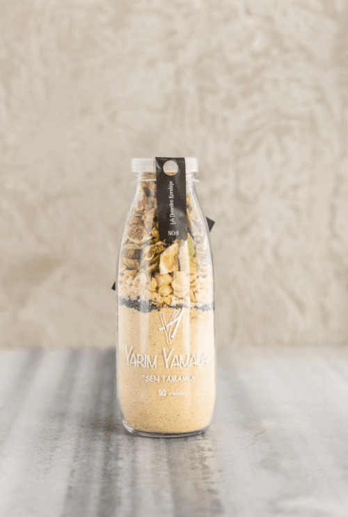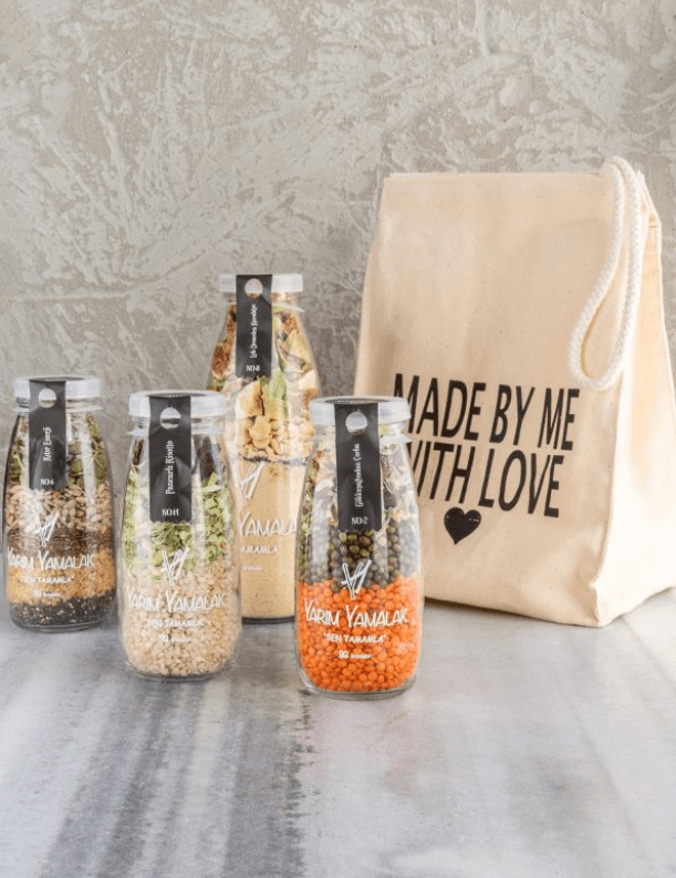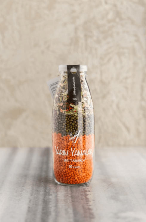SG: İlk yola çıkışımız, insanların pandemi sırasında, dışarıdan sipariş verilen yemekleri gönül rahatlığı ile tüketebilmesi için ısıl işleme tabi tutarak tüketebilecekleri, son 15-20 dakikasındaki süreci onlara son dokunuş olarak bıraktığımız yemekler üretmek üzerine kurgulanmıştı. Mutfaklarda keyif, sofralarda lezzet yaratabilmek için bir hayal kurmuştuk aslında ve sonra bu hayali kurutulmuş sebze ve meyveler ile kuru gıdalar kullanarak yarattığımız tariflerle cam bir süt şişesinin içine sığdırdık. Vitamin ve minerallerin bol olduğu glüten içermeyen veya az içeren, vegan ve vejetaryen beslenme biçimlerine duyarlı malzemeler kullandık. Seçim yaparken yerel üreticilere ve kadın emeğine farkındalık yaratmayı önemsedik. Çocuklar için çok eğlenceli, gençler için pratik, herkes için işleri kolaylaştırmak üzere hazırladığımız şişeler mutluluk yaratmaya odaklandı.